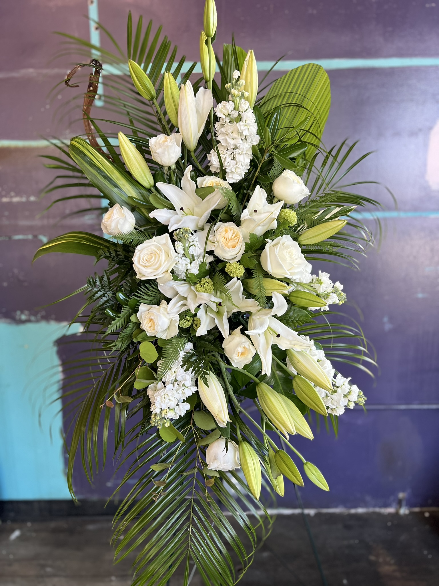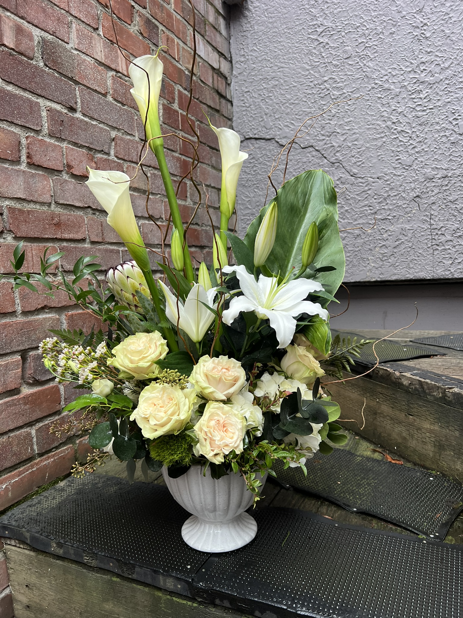 Whether you seek multiple displays or a single arrangement, each piece is created with sensitivity and artistry. We offer both a la carte selections for individual pieces, and fully custom memorial designs to reflect the spirit of your loved one – through color palettes, symbolic blooms, and personalized details.