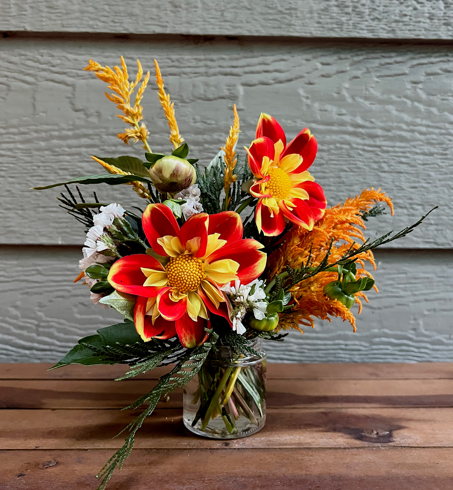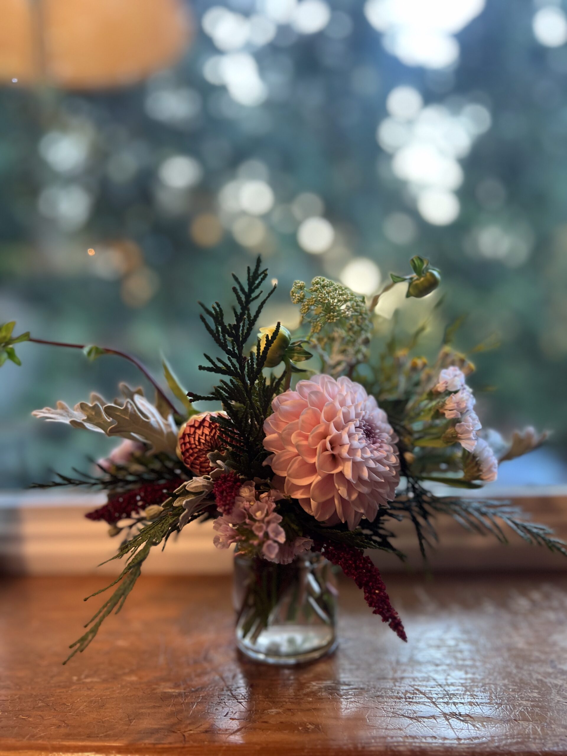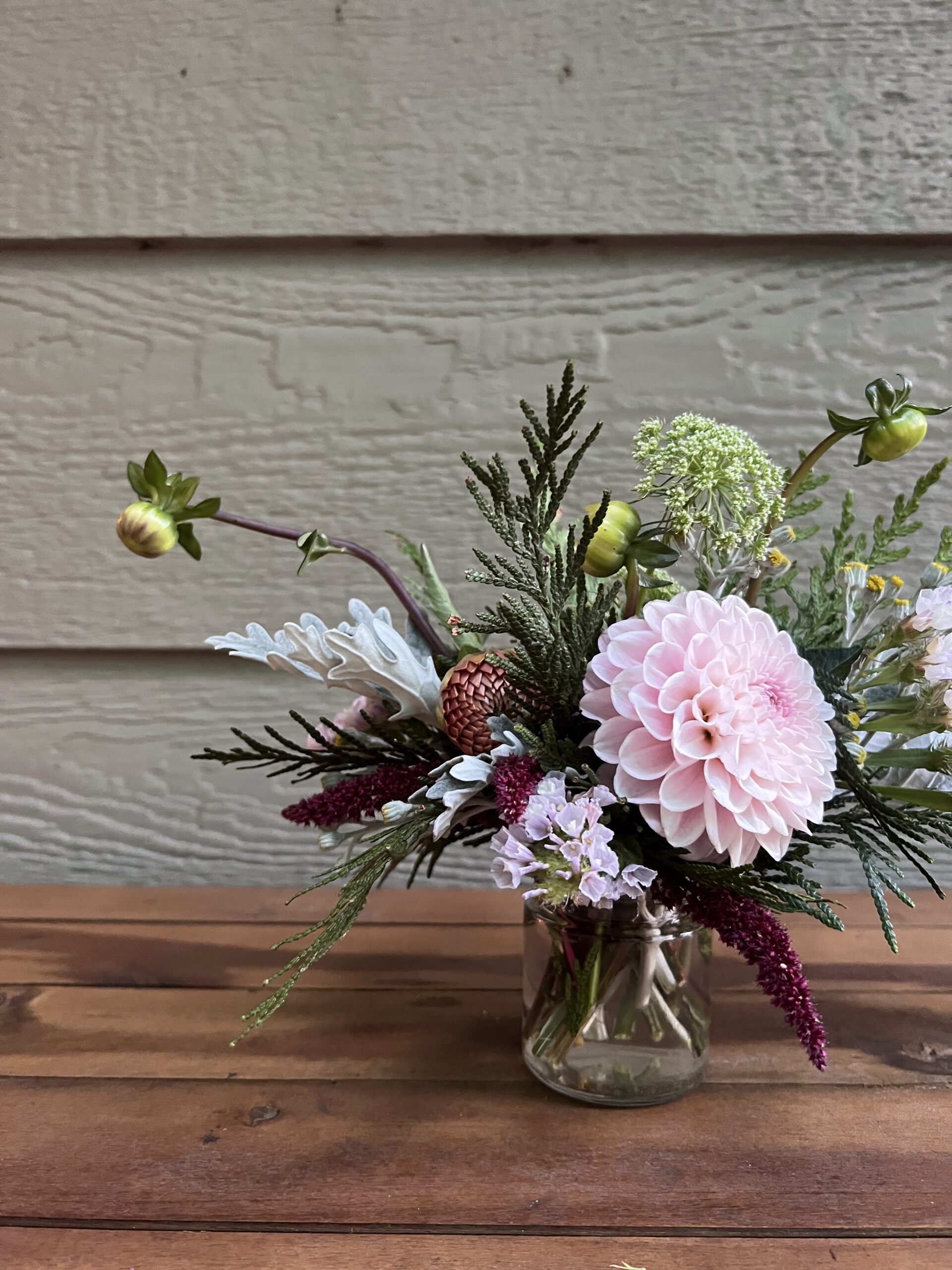 Small but mighty, Buddy is our tiniest arrangement – a 2″ recycled bud jar filled with seasonal greenery and a playful pop of color. Think of it as a floral wink: perfect for a desk, bedside, or just because. Whether you’re budget conscious, a college student, or simply love the charm of something mini, Buddy is an easy little dose of good vibes.